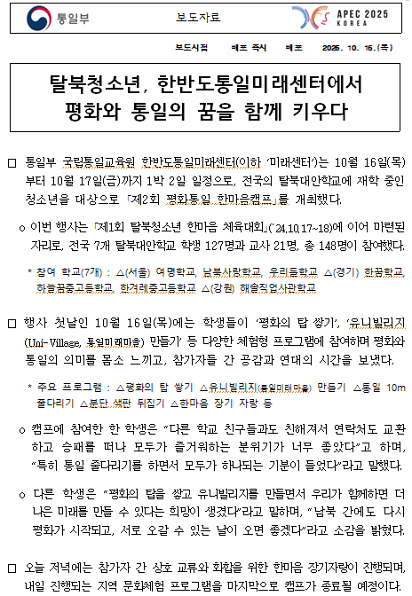 251016 (보도자료) 제2회 탈북청소년 한마음통일캠프 개최(10.16-17).pdf